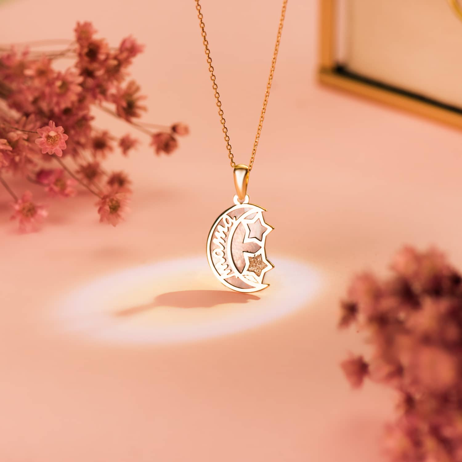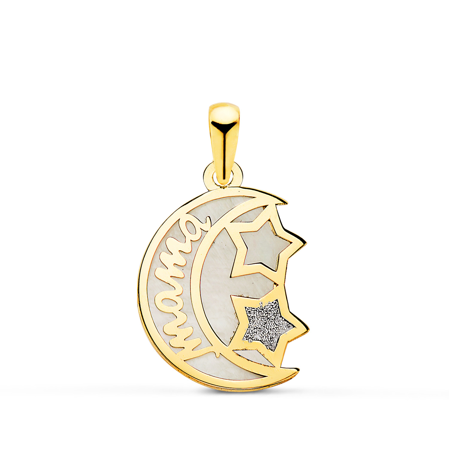 18K COLGANTE DE ORO AMARILLO NACAR FORMA DE LUNA Y MAMA CON ESTRELLAS 16X13MM