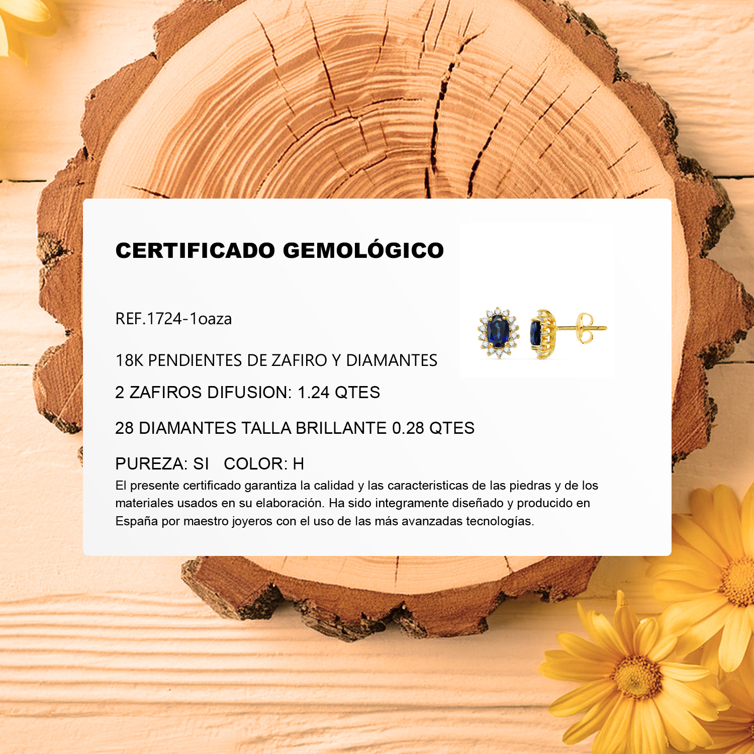 18K PENDIENTES ORO AMARILLO ZAFIRO 1.24 QT Y DIAMANTES 0.280QT SI H. 10X8MM CIERRE PRESION